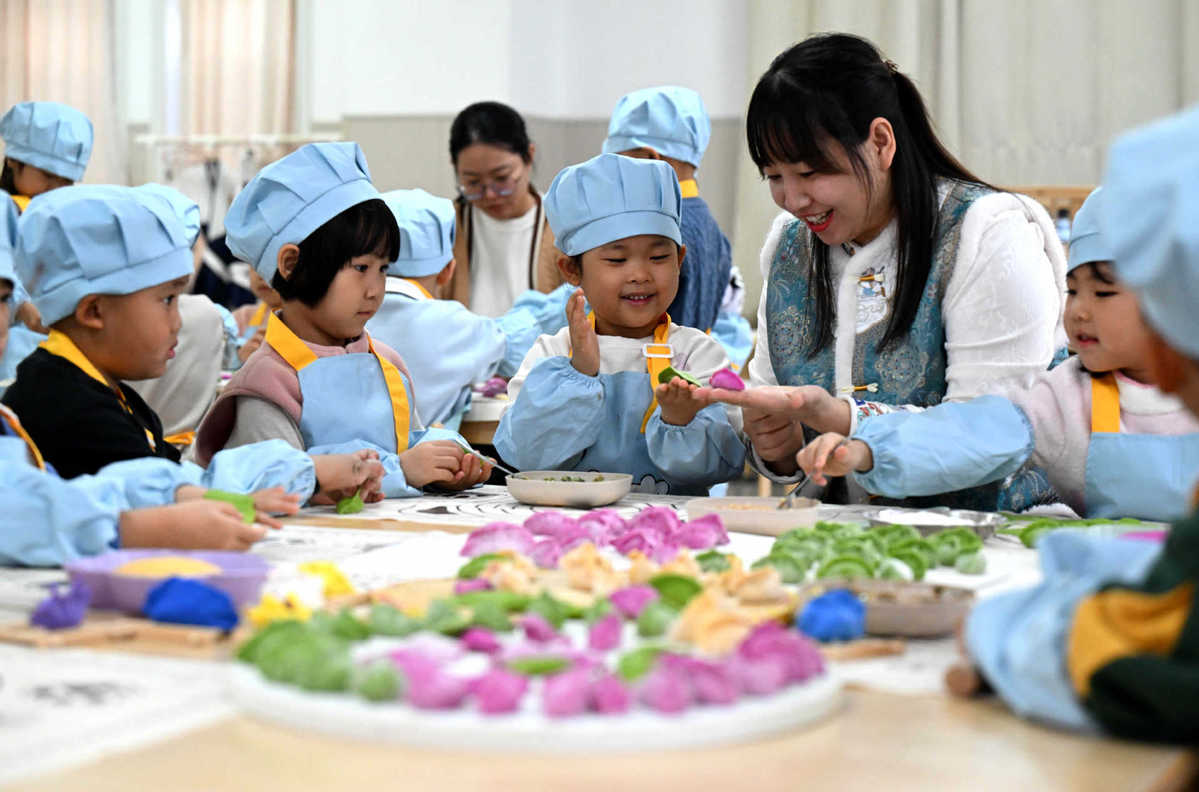 2025年12月19日,河北省石家庄市新华区第一幼儿园,老师指导孩子们包饺子。图片来源:新华社